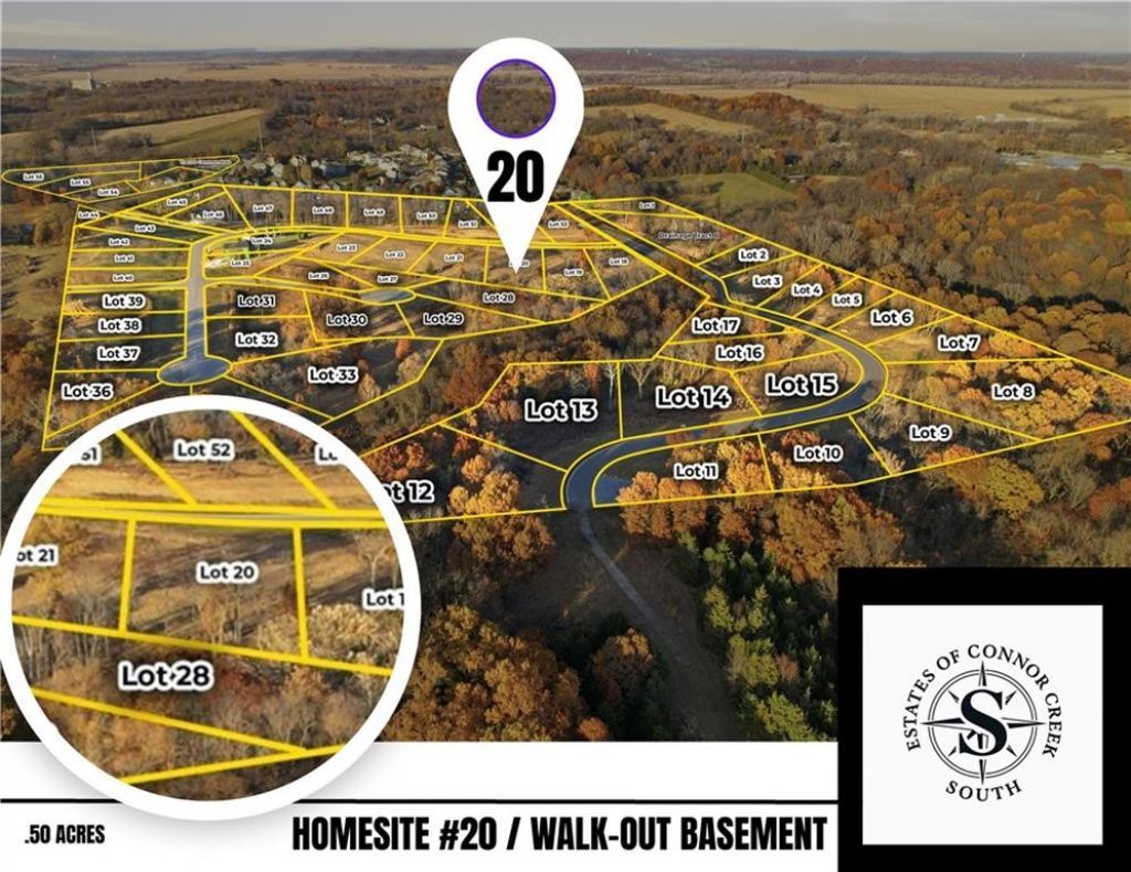 ½ ACRE WALK OUT BUILD READY HOME SITE #20 = Where Luxury Breathes & Dreams Break Ground! A place where the horizon stretches wider, the air feels lighter & the promise of your future home begins long before the foundation is poured. On the edge of Kansas City, a new community set apart featuring a rare collection of homesites that have been carved into the rolling landscape just beyond the Legends in Kansas City, KS! A mix of sprawling .5+ acre to 1+ acre estate lots that invite you to design a residence worthy of your dreams. Each homesite offers sweeping views, surrounded by mature trees, open skies, and the quiet rhythm of nature?all set along winding paved streets with curbs, gutters + city sewer! Where countryside serenity meets effortless access in the award-winning Piper School District. A premier location just 20 minutes from KCI International Airport, the historic charm of Weston, the riverfront elegance of Parkville, the vibrant culture of Lawrence & the stability of Fort Leavenworth. Youre also around the corner from The Legends premier shopping, elite dining and sporting events and venues. Championship golf courses, natural sanctuary of WYCO Lake w/ chart-topping musical performances at Azura Amphitheater. Finally, convenience is within reach?yet life feels wonderfully private. Existing Amenities help set the tone for elevated living w/o the wait. Those seeking guidance. Our ONSITE preferred custom builder stands READY to collaborate OR help you find the right builder & turn your dreams into reality! This is not simply a place to build a home, it is the beginning of your story! Take a scenic drive & preview this EXCLUSIVE collection of 56 beautiful homesites, each tucked into the reserved hills of this BRAND-NEW community, where your estate begins with a dream & rises into a life lived beautifully in the heart of Kansas City, KS.
