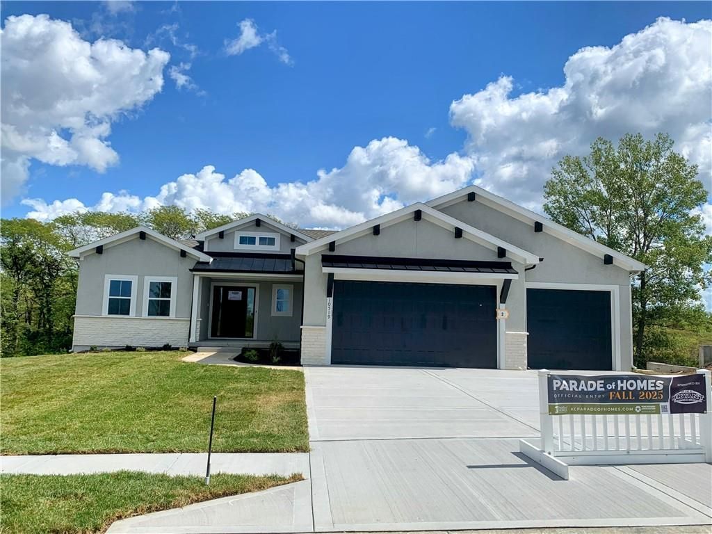 Move In Ready!!! Stunning New Construction Tatum Reverse 1,5 Story designed and built by Award-Winning New Mark Homes. Introducing a beautifully designed new floorplan by renowned builder New Mark Homes, located on a premium walkout lot that backs to greenspace. This thoughtfully crafted home offers main-level living with designer finishes, functional spaces, and scenic views?perfect for modern lifestyles. The open-concept great room welcomes you with hardwood floors, a gas fireplace, and custom built-in shelving. The gourmet kitchen is a showpiece, boasting a large island, quartz countertops, custom cabinetry with glass uppers, a walk-in pantry, and a gas range. The generous breakfast room offers ample space for family and guests alike. The main-level primary suite is a private retreat, featuring a spacious walk-in closet and a spa-like en-suite bath complete with a free-standing soaker tub, quartz countertops, a beautifully tiled shower, and a double vanity. A secondary bedroom on the main floor adds flexibility?perfect for guests or a home office. Youll also find a laundry room and mudroom for added convenience. Step out onto the covered deck and take in the peaceful wooded view, or head downstairs to the finished walkout lower level, which includes two additional bedrooms, a full bath, wet bar, and a large family room filled with natural light thanks to generous windows. Located in a vibrant community featuring a swimming pool and walking trails, and served by award-winning North Kansas City Schools, this home is the perfect blend of luxury, comfort, and lifestyle. Taxes, rooms sizes & sqft approx. Staging furniture not included.