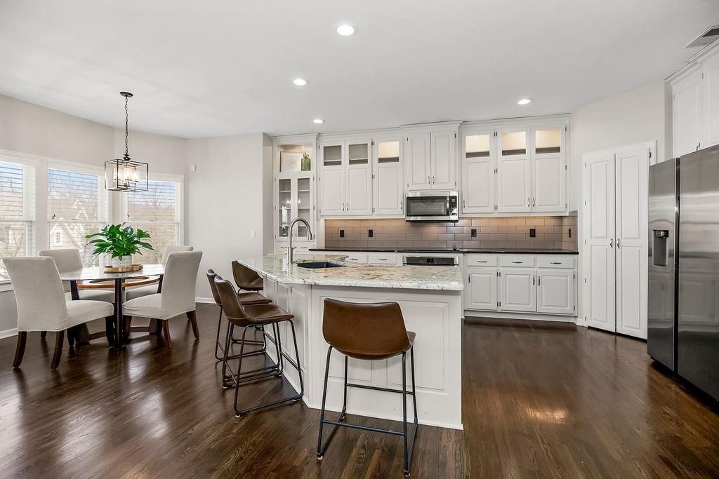 This spacious 2-story home on a large corner lot backs to green space and offers over 3,100 square feet with 4 bedrooms, 3 full and 1 half bathrooms. With a layout designed for both everyday living and entertaining. The main level features a bright kitchen with white cabinetry, under-cabinet lighting, stainless steel appliances, a cooktop, a pantry, and both formal and casual dining spaces. A cozy hearth room with a see-through gas fireplace connects seamlessly to the family room and leads out to a newer covered deck. Upstairs, all four bedrooms provide comfortable living, including a generous primary suite with a tray ceiling, a jetted tub, a walk-in shower, a double vanity, and a walk-in closet. Laundry room on the second floor for added convenience. The finished walk-out basement is built for entertaining, complete with a full wet bar, wine storage, a beverage fridge, and a surround sound system, and walks out to a fenced-in yard with a partially covered patio and an outdoor bar! Additional updates include a new roof in 2024, newer exterior paint, and entry lighting. Located in the Thousand Oaks community with neighborhood amenities including pools, trails, tennis courts, and more!
