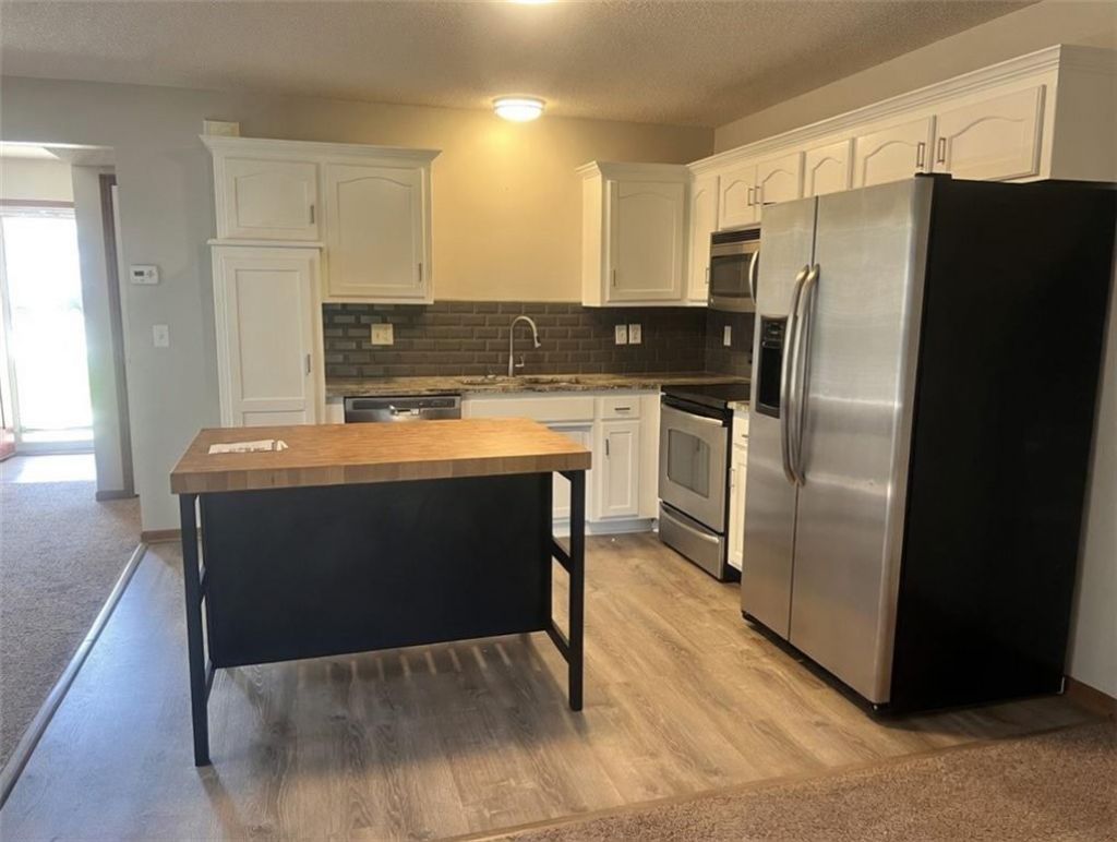 Welcome to this beautifully maintained two-story home in a desirable Lees Summit neighborhood! Offering generous living space with modern updates and comfortable finishes throughout, this home is perfect for anyone seeking low-maintenance ownership with plenty of room to grow.Step inside to a bright, open-concept main level featuring a stunning kitchen as the heart of the home. The kitchen boasts crisp white cabinets, granite-look countertops, a large center island with wood top (ideal for meal prep or casual dining), stainless steel appliances, and a stylish dark tile backsplash. It flows seamlessly into the living areas, making entertaining a breeze.Upstairs, youll find several generously sized bedrooms with neutral carpet and ample natural light from large windows. The primary suite includes a huge walk-in closet for maximum storage. Additional highlights include a convenient half bath on the main level, a full hall bath, and a practical master bath setup.Whether youre looking for your next family home or a smart investment property, this home delivers comfort, style, and functionality in one of Lees Summits most convenient locations.