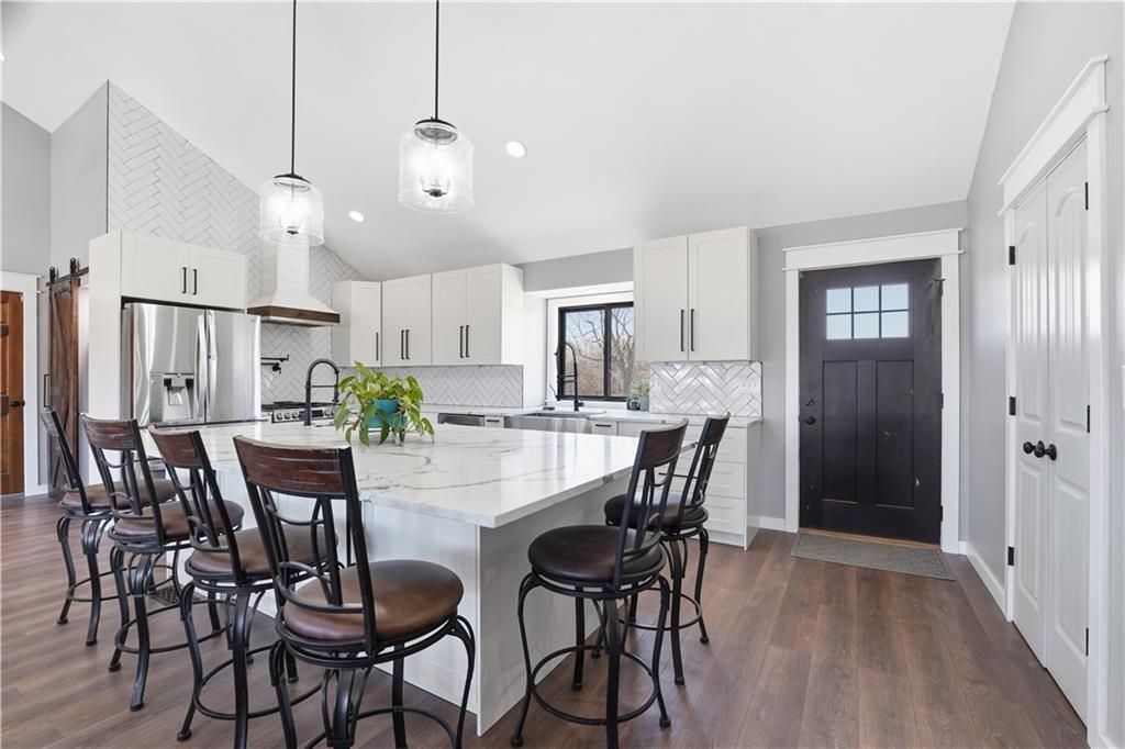 Welcome to your private retreat on over 3 acres, offering the perfect blend of modern updates and functional country living! This beautifully renovated property features a 30 x 60 powered outbuilding with water and fresh paint, plus an additional 24 x 48 outbuilding with four garage doors, giving you incredible space for hobbies, storage, or a workshop.Inside, the home has been completely transformed with over $100,000 in high-end renovations, including a redesigned layout with vaulted ceilings and an open-concept feel. The kitchen shines with quartz countertops, new cabinetry, an oversized island, double sinks, gas range with pot filler, drawer microwave, and walk-in pantry, plus a charming bay window over the sink.The living room features new LVP flooring, a fireplace insert, and large picture windows with French doors to the backyard, filling the space with natural light. Upstairs offers 3 bedrooms, 2 full baths, and laundry, while the finished basement includes a second living area with wood-burning stove, 4th bedroom, office/flex room, and interior storage.Major updates include a brand new $30,000 roof, tankless water heater, new garage doors, updated lighting, privacy fencing, and propane with underground line to the backyard for grilling.Located just off blacktop roads and centrally positioned between Gardner, De Soto, and Baldwin City, this property offers peaceful acreage living with easy access to nearby amenities.