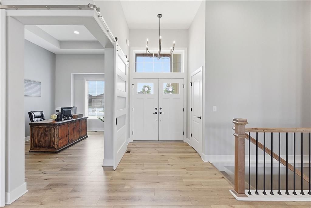 Bright and airy reverse 1.5 story designed for easy living and effortless entertaining. Luxury vinyl plank flooring runs throughout the main level, complementing the open floorplan and creating a seamless flow from room to room. A stunning wall of windows along the back of the home fills the space with natural light, making every area feel warm and inviting. The kitchen is both functional and beautiful, featuring abundant cabinetry and a large center island thats perfect for gathering. The spacious primary suite offers a private retreat with a custom feature wall, direct access to the deck, dual vanities, a relaxing soaker tub, and a generous walk-in closet. A dedicated office on the main level provides the perfect work-from-home setup or quiet flex space. The walk-out lower level expands your living area with a large family room, wet bar, three additional bedrooms, and a second laundry room, ideal for convenience and hosting. Step outside to enjoy the large yard from either the covered deck or patio, perfect for relaxing or entertaining in any season.