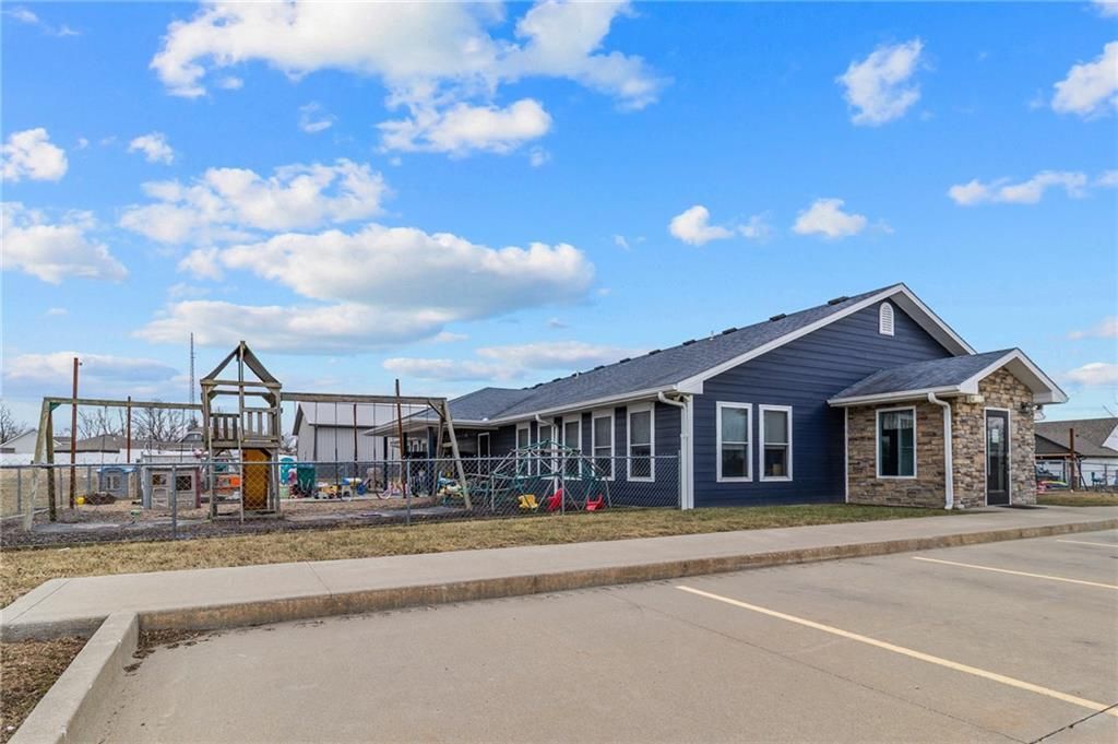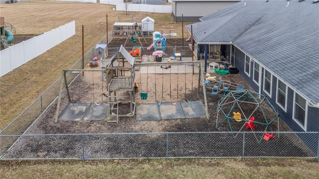 One story ranch style building featuring a private office at the reception area, a full kitchen with a pantry, three large primary classrooms, and three playgrounds. When you enter the building the office is right off the reception entry way. The kitchen has two refrigerators, two ovens, commercial sink, walk in pantry, microwave and cabinets. The classrooms each have wall shelving units, bathrooms, sinks, and a door to the corresponding outside playground. Parking lot has 18 parking spots.