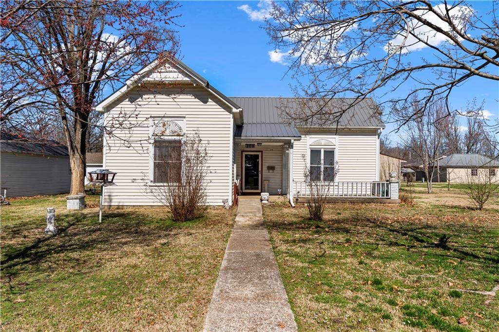 This 2 bedroom, 2 bathroom bungalow offers approximately 1,300 square feet of living space with a practical layout and flexible room options. Wood appearance flooring runs through much of the home while vinyl windows allow natural light to fill the main living areas.The formal dining room sits at the heart of the home and serves as a welcoming space for gatherings and everyday meals. The living room flows easily into the dining area, creating a natural connection between the main living spaces. The kitchen provides ample cabinet storage, generous counter space, and a convenient breakfast bar. A main level laundry area located just off the kitchen adds everyday convenience.Both bedrooms are generously sized, including a primary bedroom with a private bathroom featuring a walk-in shower. The second bathroom is accessible from the second bedroom and is also conveniently located for guest use.An additional room offers flexible space that could serve as a home office, hobby room, or extra storage. The layout also provides the option to create a third bedroom if desired, with the current living room easily transitioning into bedroom space while the formal dining room could serve as the main living area and the spacious kitchen accommodate an eat-in dining setup.Outside, the property features a covered front porch, an attached garage with rear entry access, and a detached shed for additional storage. Rear alley access provides convenient garage entry while on-street parking is available at the front of the home.Located in Rich Hill, Missouri, this bungalow offers flexible living space and approximately 1,300 square feet of living area.