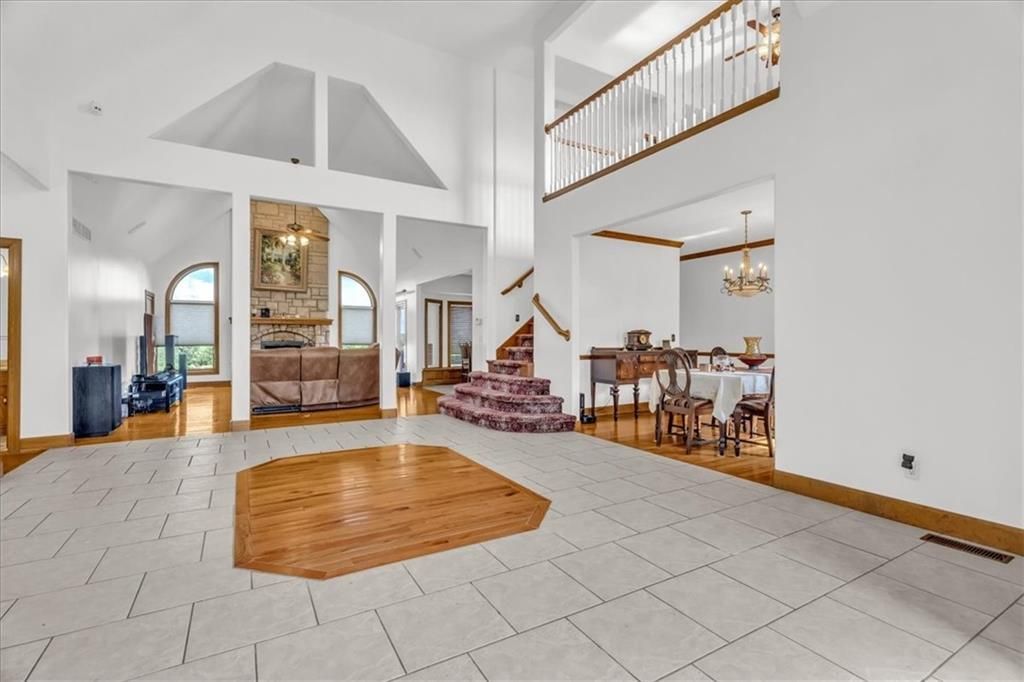 **Seize a rare opportunity: Own nearly 23 acres +- of hobby ranch paradise.** This secluded haven boasts a blacktop drive leading to a stunning home designed for main-floor living. Revel in a desirable layout featuring hardwood floors, granite finishes, a stone fireplace in the grand family room, and a spacious eat-in kitchen with formal dining. New windows and fresh interior paint. Enjoy the den, loft, and ample bedrooms for everyone. The partially finished lower level includes a vault and walk-out patio. Outside, discover a small orchard, outbuildings, all with concrete pads, water, and electricity, including a chicken coop. The main shop is an impressive 40x110 with 16 walls, 11 plus garage doors, and a 2-bedroom, 2 bathroom in-law quarters with all the amenities. A second outbuilding offers 2 stable stalls and another 5 plus garage space, one with a 14 opening. Both outbuildings have RV hook-ups. Benefit from solar panels, a backup generator, and a fully stocked pond. Bring your animals and embrace the tranquil outdoors, all while being minutes from city conveniences, Legends sporting, NASCAR speedway, shopping, dining, and major highways.