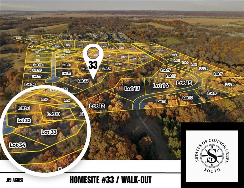 JUST UNDER 1 ACRE, CUL-DE-SAC, WALK OUT BUILD READY HOME SITE #33 = Where Luxury Breathes & Dreams Break Ground! A place where the horizon stretches wider, the air feels lighter & the promise of your future home begins long before the foundation is poured. On the edge of Kansas City, a new community set apart featuring a rare collection of homesites that have been carved into the rolling landscape just beyond the Legends in Kansas City, KS! A mix of sprawling .5+ acre to 1+ acre estate lots that invite you to design a residence worthy of your dreams. Each homesite offers sweeping views, surrounded by mature trees, open skies, and the quiet rhythm of nature?all set along winding paved streets with curbs, gutters + city sewer! Where countryside serenity meets effortless access in the award-winning Piper School District. A premier location just 20 minutes from KCI International Airport, the historic charm of Weston, the riverfront elegance of Parkville, the vibrant culture of Lawrence & the stability of Fort Leavenworth. Youre also around the corner from The Legends premier shopping, elite dining, endless entertainment and sporting events and venues! Championship golf courses, natural sanctuary of WYCO Lake w/ chart-topping musical performances at Azura Amphitheater. Finally, convenience is within reach?yet life feels wonderfully private. Existing Amenities help set the tone for elevated living w/o the wait. Those seeking guidance. Our ONSITE preferred custom builder stands READY to collaborate OR help you find the right builder & turn your dreams into reality! This is not simply a place to build a home, it is the beginning of your story! Take a scenic drive & preview this EXCLUSIVE collection of 56 beautiful homesites, each tucked into the reserved hills of this BRAND-NEW community, where your estate begins with a dream & rises into a life lived beautifully in the heart of Kansas City, KS.