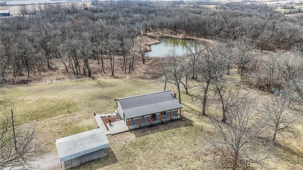 Imagine that perfect country home. Do you see yourself sitting high above your own pond, watching ducks lazily circle before landing? Picture gazing at the tree line as deer emerge in the early evening, or neighbors passing by in a horse and buggy rather than a pickup truck. Have you dreamt of a manicured yard, a new fruit orchard, or a 2,800 sq. ft. outbuilding with utilities? Is your ideal home perched on a high spot with views for miles in every direction? If so, this is your dream come true! This beautiful 15.7-acre property only minutes from Whiteman AFB features rolling terrain, a stunning stocked pond, and a stream winding through the land. Enjoy open spaces, breathtaking views, lots of wildlife and timber with trails to explore. The low-maintenance, metal-sided 1,686 sq. ft. ranch home offers three bedrooms, two and a half baths, and a finished walk-out basement. Recently remodeled and repainted, the kitchen boasts butcher block counters, an island, upgraded fixtures, and a deep country sink. The open floor plan in the main living area creates a welcoming space, while the finished basement includes a second kitchen?ideal for a mother-in-law suite. Step out onto concrete patios or a deck off the main living area, overlooking the pond?providing everything you need for the contented country life youve always imagined. There is plenty of room in the 3024 sf outbuilding with electricty and a water hydrant for both work and toys. A newly planted Orchard pollinated by your own bee hives completes the picture. Here, you can watch both sunrise and sunset from the same spot. If you value seclusion, privacy, beauty, and serenity, this property checks every box. Dont miss the chance to make it yours! NEW PRICE, PLUS $10K SELLER CREDIT TO USE FOR LOWER PRICE, REMODELING, OR RATE BUY DOWN!!!